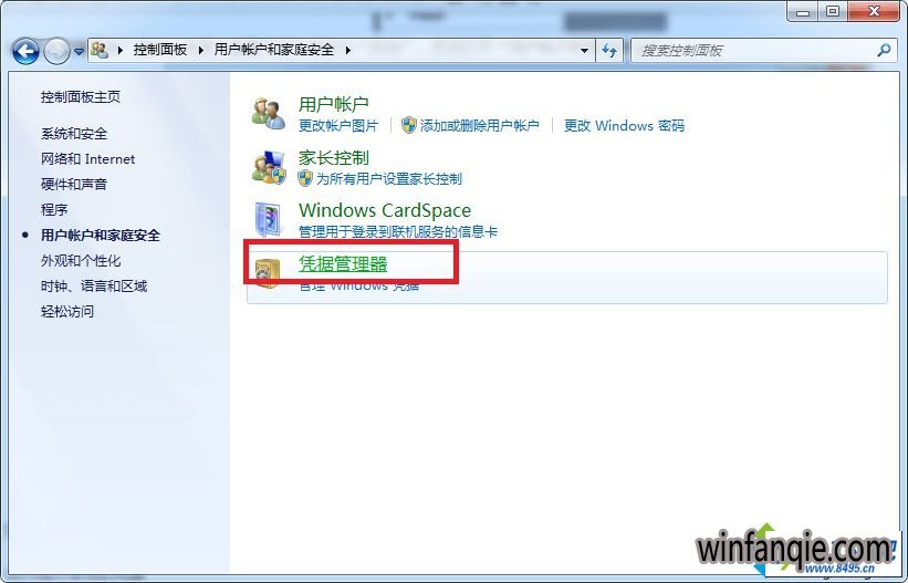 3、来到“用户帐户和家庭安全”窗口后,打开“凭据管理器”;