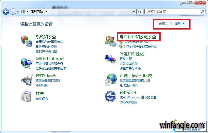 2、在“控制面板”窗口,先把“查看方式”修改为“类别”,然后打开“用户帐户和家庭安全”;