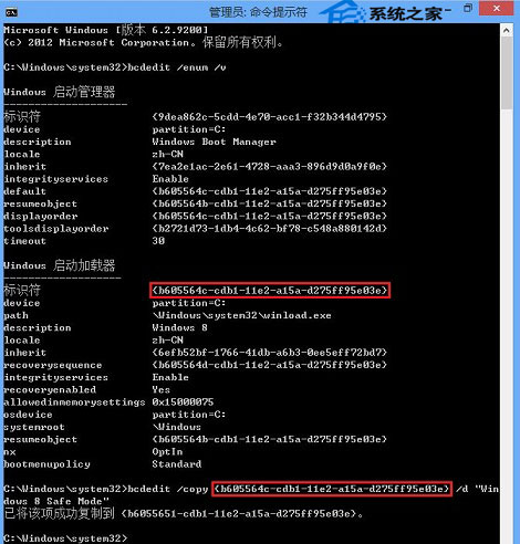 2.运行“bcdedit /copy {标示符} /d “Windows 8 Safe Mode””回车拷贝启动文件。例如:bcdedit /copy {b605564c-cdb1-11e2-a15a-d275ff95e03e} /d “Windows 8 Safe Mode”(以空格隔开)。标示符较长,可以右键点击选择标记选择后再按“Ctrl+C”再右键选择粘贴哦!