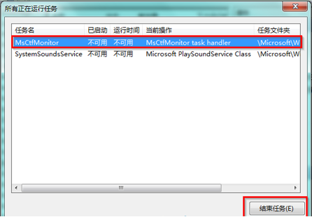 3.在出现的“所有正在运行任务”窗口中,查看是否有“取消关机”提示后,仍然阻止系统自动关机的任务在运行。如果有,则将其删除即可。删除方法:点选阻止系统自动关机的任务,选中后点击“结束任务”。